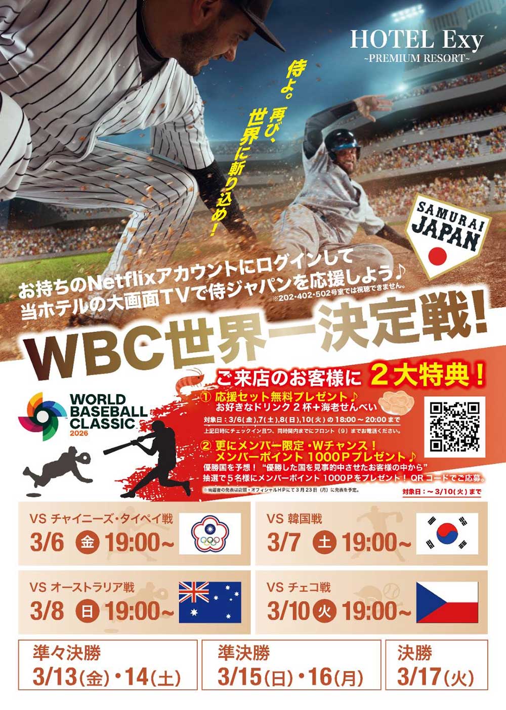お持ちのNetflixアカウントにログインして、当ホテルの大画面TVで侍ジャパンを応援しよう♪